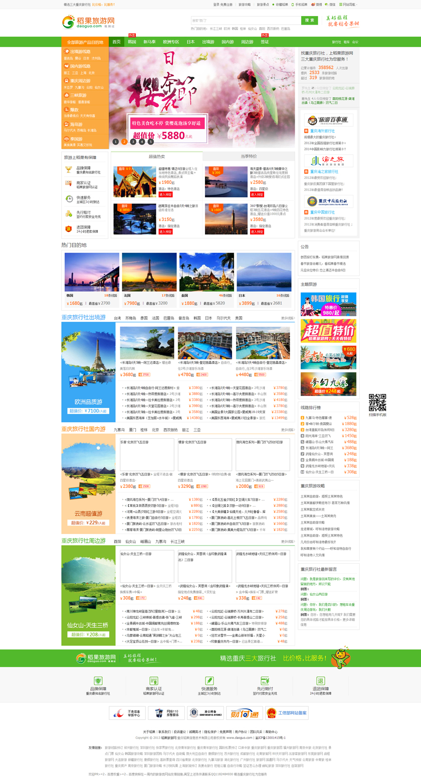 稻果旅游网是大重庆地区最大的在线旅游产品预定平台,日前更是开通成都站,已有四家知名品牌旅行社:四川中国青年旅行社旅行社、四川中国国际旅行社、成都环球旅行社、四川康辉国际旅行强势入驻。每天为上万游客提供数万条精品旅游线路以及单项旅游产品预定服务。稻果旅游网下一步将开通昆明站、贵阳站,致力成为中国西南地区最大的在线旅游“超市”。