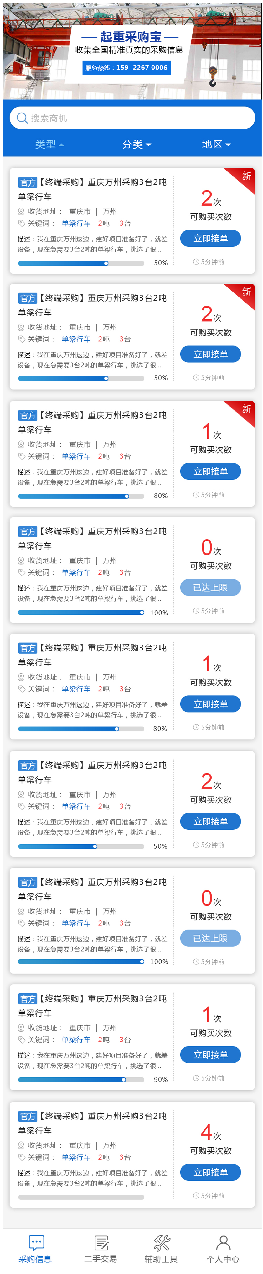 Project Description 欢迎您关注起重采购宝,我们每天为您实时推送全国各地真实有效的起重设备采购信息,让您直接面对终端采购客户,起重采购宝助您生意更上一层楼! Official website address 阿里# I want to share